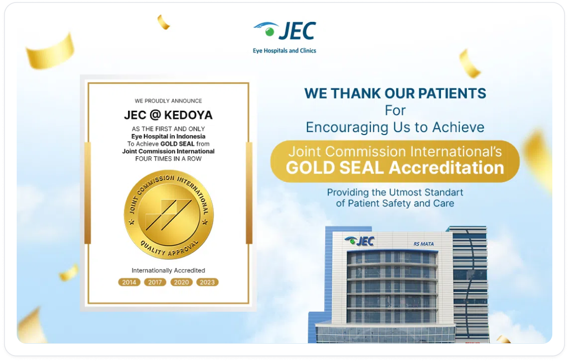 Setelah melalui proses penilaian selama tiga hari yang dilangsungkan pada tanggal 18 – 20 September 2023, RS Mata JEC @ Kedoya Kembali meraih sertifikasi akreditasi internasional dari Joint Commission International, efektif pada tanggal 21 September 2023.
